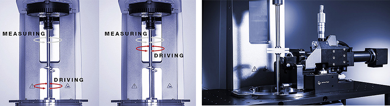 在反向運動模式下,流變儀將兩套空氣軸承 EC 馬達(dá)均用作驅(qū)動裝置和扭矩傳感器。兩個馬達(dá)可以輕松設(shè)置為以相反方向旋轉(zhuǎn),這可以用來在測量樣品中形成固定的停滯面,以便采用顯微鏡進(jìn)行剪切條件下材料的先進(jìn)結(jié)構(gòu)分析。此模式也可以與通用拉伸夾具結(jié)合使用,以便在最小的測量扭矩下進(jìn)行拉伸測量。就速度而言,反向運動模式更讓測量工作“事半功倍” — 最高速度差高達(dá) 6000 rpm,這大大拓寬了高剪切應(yīng)用的剪切速率范圍。