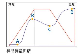 ① 糊化的開始點 (A)② 最高糊化粘度(B)③ 糊化溫度④ 恒溫段粘度(B-C)⑤ 最終冷糊粘度(D)