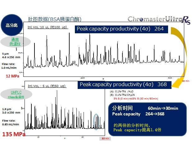 新型色譜柱(250 mm長、填料粒徑1.9 µm)的理論塔板數(shù)和峰容量更高。該色譜柱可耐受的壓力更高,與填料粒徑5 µm的色譜柱相比(即使長度相同),分析時間縮短一半,而峰容量提高了1.4倍。