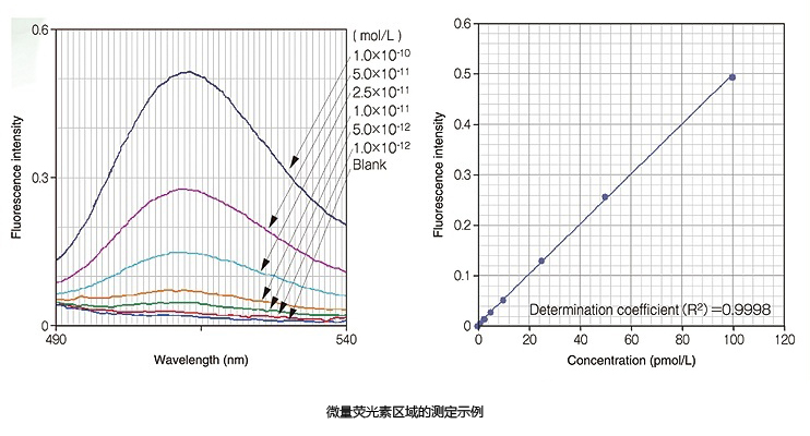超高靈敏度在實(shí)際分析案例中體現(xiàn)更為明顯,以Blank(純水)為參照,使用F-4700可檢測(cè)低至1×10-12mol/L(亞皮摩爾)量級(jí)的熒光素。從線性曲線圖可知,即使在痕量區(qū)域,也能獲得很好的線性關(guān)系。