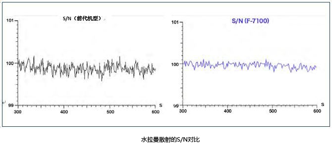 上圖所示是F-7100與F-7000水拉曼散射的S/N對比情況。F-7100靈敏度是前代機型的1.5倍,即便是微弱的信號,也能實現(xiàn)低噪聲檢測。
