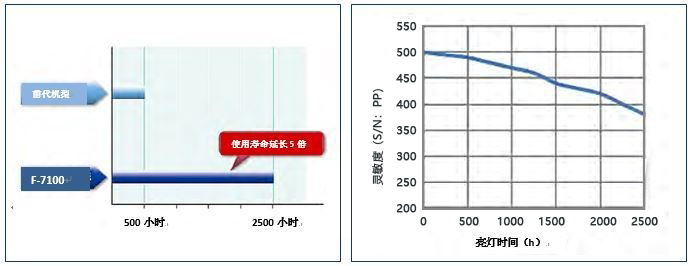 F-7100采用全新氙燈,并改良了燈電源,使得光源亮度提升,并有效延長了氙燈的使用壽命。延長燈泡更換周期可降低耗材成本,減輕燈泡更換等作業(yè)負擔(如上左圖)。由如上右圖可知,F(xiàn)-7100性能卓越,即使氙燈使用接近2500h,也能夠維持較高的靈敏度。