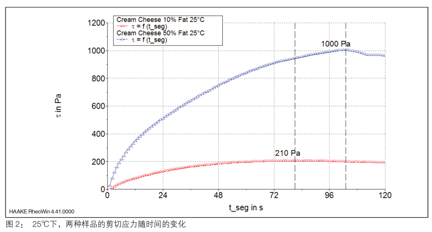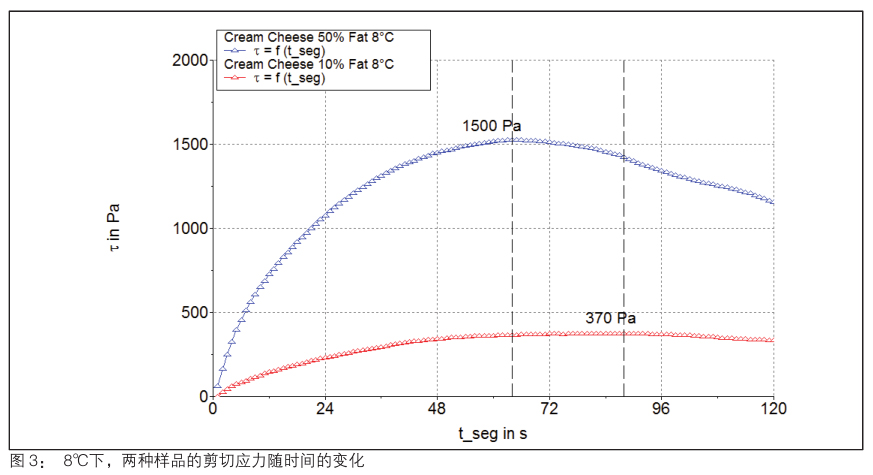 彈性響應(yīng)后,其結(jié)構(gòu)遭到破壞并且剪切應(yīng)力開(kāi)始下降。實(shí)驗(yàn)結(jié)果中剪切應(yīng)力在整個(gè)測(cè)試時(shí)間內(nèi)的最大值就對(duì)應(yīng)了樣品的屈服應(yīng)力。圖 2 是兩種樣品在室溫下的測(cè)試結(jié)果,可以看出,脂肪含量高的樣品的屈服應(yīng)力為 1000Pa,而低脂肪含量樣品的屈服應(yīng)力則為210Pa。而圖 3 則是兩種樣品在較低溫度下(8℃)的結(jié)果,相當(dāng)于樣品剛從冰箱內(nèi)取出的溫度。其結(jié)果表明高、低脂肪含量的樣品在此溫度下的屈服應(yīng)力都有所上升,分別為 1500Pa 和 370Pa。結(jié)合上述結(jié)果,當(dāng)考慮將此類(lèi)食品涂抹在某些剪切模量低至1200Pa 白面包上時(shí)就會(huì)出現(xiàn)問(wèn)題,因?yàn)樵诶洳貤l件下的奶油奶酪的屈服應(yīng)力遠(yuǎn)大于面包所能承受的剪切模量。