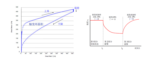 觸變性是膠黏劑的一個很重要的特性,一般的理解是與時間相關的行為,可以考察膠黏劑在使用過程中的流平與垂掛性能。左圖觸變環(huán)實驗表明樣品觸變性的大小,右圖三段式模擬樣品靜止 - 破壞 - 靜止整個過程的粘度變化,反應其流平和垂掛性能。