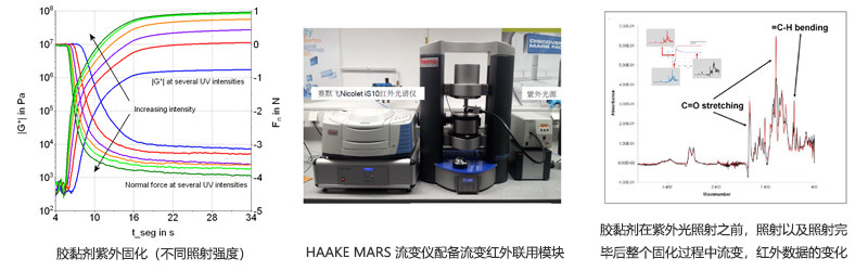 流變儀可以通過測試樣品粘彈性模量的變化全程監(jiān)測膠黏劑樣品的固化過程,包括熱固化和紫外固化,再配個哈克流變儀專利的流變 - 紅外聯(lián)用模塊,更可深入研究固化過程中樣品分子層面的變化,監(jiān)控反應動力學,反應度。