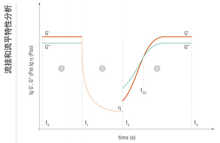 黏合劑的流掛和流平特性可通過 3 段觸變測試(3iTT) 進(jìn)行確定.該測試可在旋轉(zhuǎn)、振蕩或兩者結(jié)合的情況下進(jìn)行.具體取決于儀器類型和您的需求。測試結(jié)果可預(yù)測黏合劑在應(yīng)用(2)后與初始樣品特性(1)相比如何恢復(fù)其內(nèi)部結(jié)構(gòu)(3),以確保理想的流平和濕膜厚度,從而防止流掛。