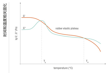在振蕩測試中,可在整個過程中對材料進(jìn)行表征:應(yīng)用前作為液體黏合劑,以監(jiān)測固化過程以及評定最終固化產(chǎn)品。在此處,使用彈性和黏性模量(G’和 G”)描述樣品特性,兩者均用干等溫測試和溫度掃描。部分結(jié)晶的熱熔黏合劑的升溫曲線包括玻璃化轉(zhuǎn)變溫度(Ts)橡膠態(tài)平臺以及最終熔點 (Tm),超過熔點后黏合劑會變成液體并能使用。