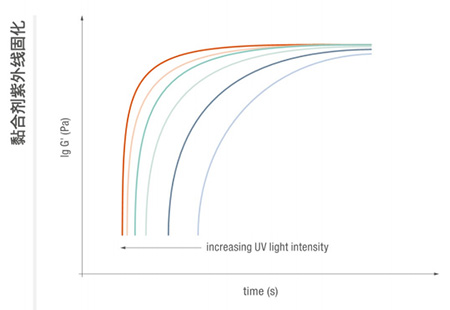 可應(yīng)用不同紫外光強(qiáng)度以顯示對印刷油墨紫外線固化的影響:應(yīng)用的紫外光強(qiáng)度越高,固化過程進(jìn)展越快,且樣品的最終硬度(G')越高。