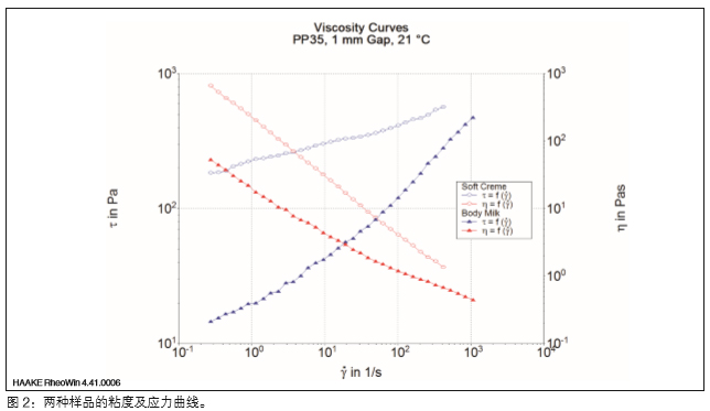 如果一個材料具有屈服應力,它在低于其屈服應力的剪切應力作用下會表現(xiàn)出彈性的性質(zhì),當剪切應力高于屈服應力時,則表現(xiàn)為液體的特性。因此,測試樣品是否具有屈服應力以及其大小的最好方法是直接線性增加剪切應力,然后觀察樣品性質(zhì)的變化 [1]。然后根據(jù)哈克 RheoWin 軟件的計算功來得到相應的屈服應力的評估數(shù)據(jù)(圖 5)。使用這種方法的優(yōu)點是,樣品在屈服應力前后的性質(zhì)都可以被記錄下來,而不用去進行額外的外推,這樣可以大大提高測試重復性以及計算數(shù)據(jù)的可靠性。從數(shù)據(jù)上看,護膚液幾乎沒有屈服應力,而乳霜則很明顯屈服應力,大約為 110Pa。