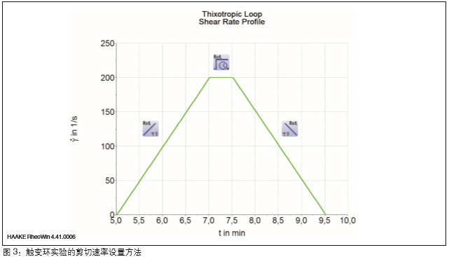 粘度 測試粘度的最佳方法測試樣品的穩(wěn)態(tài)粘度,例如穩(wěn)態(tài)粘 度隨剪切速率的變化。與瞬時粘度相比,穩(wěn)態(tài)粘度與時 間效應及剪切速率變化的斜率無關(guān)。在4 個數(shù)量級的剪 切速率范圍內(nèi),兩種樣品的粘度都表現(xiàn)出明顯的剪切變 稀行為,如圖2 所示。與預期的一樣,乳霜在低剪切 速率下表現(xiàn)出更高的粘度但是其剪切變形行為也更加明顯。在整個測試剪切速率范圍內(nèi),乳霜的粘度下降了幾 乎 500 倍,而護膚液的粘度下降率則只有 120 倍。根據(jù) 實驗高剪切速率下粘度結(jié)果可以推測出,當剪切速率超 過 2000s-1 時,兩種樣品的粘度應該幾乎一樣。這并不 是偶然現(xiàn)象,因為將乳霜或者護膚液涂在皮膚上時所產(chǎn) 生的的剪切速率就是在這個范圍內(nèi),而此時則是皮膚感 覺最好的,因此兩種產(chǎn)品在這個條件下的粘度應該一樣。 觸變性在質(zhì)控中,產(chǎn)品的觸變性行為通常使用“觸變環(huán)”來表 征。這種測試方法與其他方法相比的優(yōu)勢在于測試時間 短。此方法包含三個步驟,剪切速率從 0 上升到最高值 (本實驗中采用 200s-1),然后在此剪切速率下平衡一 段時間,再將剪切速率降低到 0(圖 3)。通常,剪切速 率上升和下降的時間是一致的,而穩(wěn)定時間則需要足夠 長以使得樣品的粘度在剪切速率下降之前不再變化。然 后通過計算上升曲線和下降曲線之間圍城的不規(guī)則“環(huán)” 裝的面積來評估實驗結(jié)果。觸變環(huán)面積越大,樣品的觸 變性越強。但是請注意,這個實驗的結(jié)果完全取決于實 驗參數(shù),比如最大剪切速率以及剪切速率變化斜率。只 有當剪切速率設(shè)置相同時(如圖3),不同測試結(jié)果才 可以相互比較。圖4給出了兩種樣品的觸變性實驗結(jié)果, 很明顯,乳霜是具有一定觸變性的,而護膚液在完全沒有。