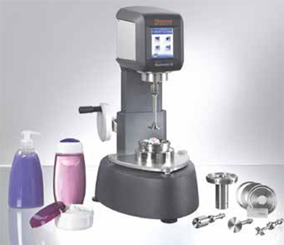化妝品產(chǎn)品的配方非常復雜,并且各類活性成分會起到 重要作用。而消費者則期望某一大類的膏霜產(chǎn)品具備相 同的質(zhì)感,無論其中的特殊成分是蘆薈,檸檬草,牛奶 還是蜂蜜。因此,開發(fā)能被消費者接受或者期待的質(zhì)感 的產(chǎn)品是化妝品配方工藝中最重要的挑戰(zhàn)之一。測試一 種乳液化妝品的流變性能則是這個產(chǎn)品質(zhì)控過程中的重 要一環(huán)。 乳液化妝品流變測試的典型參數(shù)基本是粘度,觸變性和 屈服應力。產(chǎn)品的粘度與其各類性能相關(guān),取決于應用 的剪切速率范圍。例如,在皮膚上涂抹的感覺對應于高 剪切速率下的粘度大小,而儲存穩(wěn)定性則依賴于低剪切 速率下的粘度。 一款乳液的屈服應力則決定了其儲存穩(wěn)定性及外觀和感 覺。罐裝出售的乳霜需要較高的屈服應力,消費者通常 希望能用手指從 罐中將其取出并穩(wěn)定在手上;對于瓶裝 的護膚液來說,消費者則期望其能夠像液體一樣,這就 要求其屈服應力盡可能的小。如果測試這些不同的流變 性能,則需要一臺能夠?qū)崿F(xiàn)各種測試方法并且具備寬廣 測試范圍的質(zhì)控型粘度計。為了簡單可靠的完成各類質(zhì) 控流變測試,賽默飛哈克Viscotest iQ智能流變儀(圖 1)應運而生。而這臺獨特的儀器在質(zhì)控表現(xiàn)方面具有很 多新的優(yōu)勢及特點,比如,它的靈敏度的高度提升保證 了其可以使用更小的測量夾具,并可以節(jié)約用戶的樣品 以及溫度平衡的時間和清理時間。
