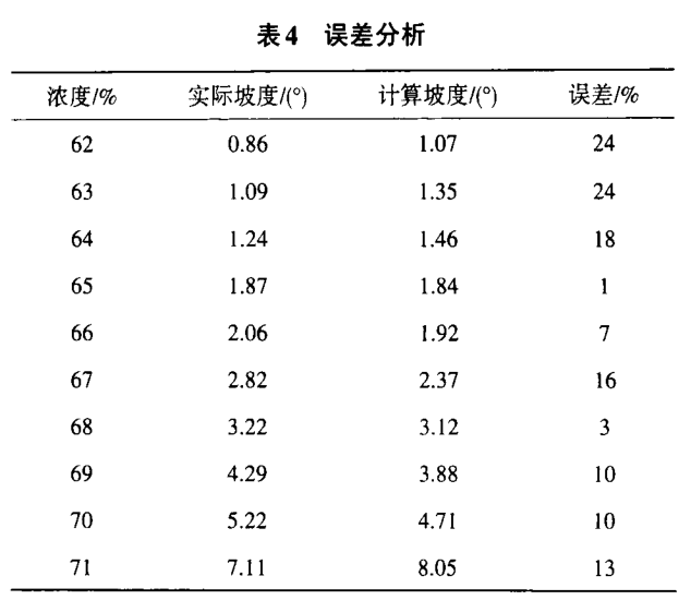 表4為各濃度條件下自流坡度的誤差分析 ,相對誤差采用式(5)計(jì)算。經(jīng)計(jì)算 ,該礦山經(jīng)驗(yàn)公式的平均誤差為12.57%,精確度達(dá)到87.43%,有較大的可信度。
