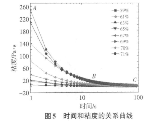 由圖5和圖6可知 ,隨著剪切速率由零開始增大,膏體結(jié)構(gòu)遭到破壞,表觀粘度迅速減小,濃度越高,這種現(xiàn)象越明顯,流變曲線偏向剪切速率軸,,如圖5中AB段。剪切速率繼續(xù)增大,即圖5中BC段,在這一階段,膏體性能穩(wěn)定,表觀粘度減小規(guī)律趨于平緩,剪切應(yīng)力與剪切速率近似線性規(guī)律,且在相同條件下,濃度越大,表觀粘度和剪切應(yīng)力也越大。