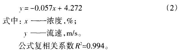 濃度和流速關(guān)系曲線如圖4所示,將,數(shù)據(jù)結(jié)果進(jìn)行回歸分析,得到回歸方程式(2)。 由式(2)看出在實(shí)驗(yàn)的范圍內(nèi),流速和濃度基本上呈線性關(guān)系,流速隨著濃度的增大而減小 ,這也是濃度越大,流動(dòng)性越小的緣故。