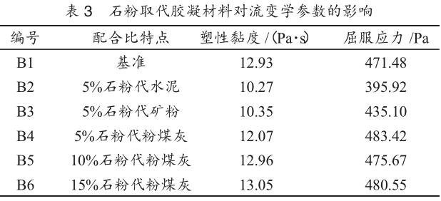 機(jī)制砂中石粉細(xì)度接近于水泥的細(xì)度,為了廢物利用,已有研究利用機(jī)制砂中石粉少量替代水泥,作為混凝土的膠凝材料。為了研究機(jī)制砂中石粉對(duì)砂漿流變性能的影響,以石粉等質(zhì)量取代部分水泥、礦粉和粉煤灰,測(cè)試砂漿的屈服應(yīng)力與塑性黏度。試驗(yàn)配合比特點(diǎn)與結(jié)果見表 3。