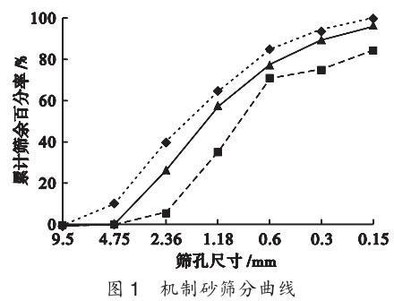 華新 P·O 52.5 級(jí)水泥;岳陽河砂,細(xì)度模數(shù) 2.5,屬于II 區(qū)中砂;福岡石灰?guī)r機(jī)制砂(水洗至石粉含量為 3%);福岡風(fēng)選石粉,粒徑小于 75 μm;武鋼礦渣粉,比表面積為552 m 2 /kg;??瞎璺?,比表面積為 18 000 m 2 /kg;武漢陽邏電廠生產(chǎn)的 I 級(jí)粉煤灰,比表面積為 444 m 2 /kg;蘇州弗克高效外加劑與格雷斯外加劑復(fù)摻,減水率 30%。水泥的主要性質(zhì)與機(jī)制砂的篩分曲線分別見表 1、圖 1。