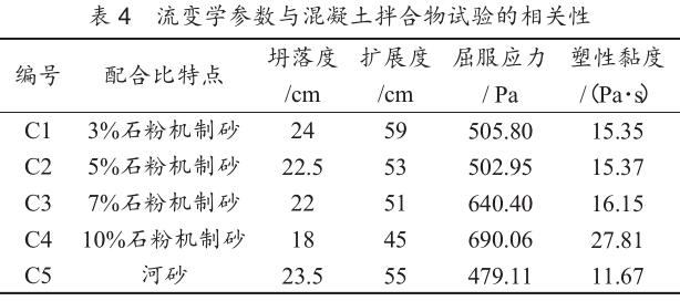 表 4 為砂漿相應(yīng)機(jī)制砂混凝土坍落度與擴(kuò)展度的測(cè)試結(jié)果。從表 4 結(jié)果可以看出,C1、C5 坍落度和擴(kuò)展度基本一致,但從實(shí)際拌制的過程中可以發(fā)現(xiàn)河砂混凝土的流動(dòng)性能要好于機(jī)制砂混凝土,并且拌合物黏性小,說明在大坍落度和擴(kuò)展度的情況下,使用這兩個(gè)指標(biāo)很難判定混凝土的流動(dòng)性能,在砂漿流變學(xué)試驗(yàn)中 C1 的塑性黏度要明顯高于 C5,表明機(jī)制砂砂漿的黏度要明顯高于河砂砂漿;隨著機(jī)制砂中石粉含量的增加,混凝土的坍落度和擴(kuò)展度均下降,屈服應(yīng)力和塑性黏度上升,表明砂漿的流變學(xué)參數(shù)和混凝土坍落度擴(kuò)展度的試驗(yàn)有一定的趨勢(shì)相關(guān)性。但當(dāng)混凝土的原材料體系發(fā)生變化時(shí),由于混凝土的組成以及顆粒之間的相互作用關(guān)系比砂漿更加復(fù)雜,使砂漿流變學(xué)參數(shù)與混凝土坍落度測(cè)試結(jié)果的相關(guān)性變差。