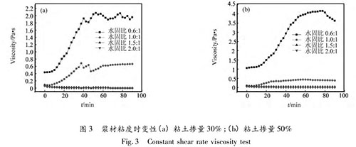 (2)水固比既影響漿材的流變模型,又影響漿材的粘度。水固比較高時(shí),漿材屬于牛頓流體,粘度基本保持不變;水固比較低時(shí),漿材為賓漢流體,粘度隨時(shí)間呈先增加后保持穩(wěn)定的趨勢(shì);