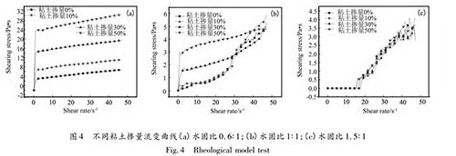 圖 4 可知,水固比為 0. 6∶ 1 的漿材屬于賓漢流體:隨粘土摻量的增大,其屈服應(yīng)力依次增大;水固比為1. 0∶ 1 時(shí),粘土摻量為 0%、10%時(shí),漿材的流變模型較為接近,剪切應(yīng)力隨剪切速率增長(zhǎng),為具有剪脹性的冪律流體,粘土比例達(dá)到 30%和 50%時(shí)為賓漢流體,在 30%時(shí)存在剪脹現(xiàn)象;水固比為 1. 5∶ 1 時(shí)為牛頓流體,且粘土摻量對(duì)漿材流變模型的影響不大。