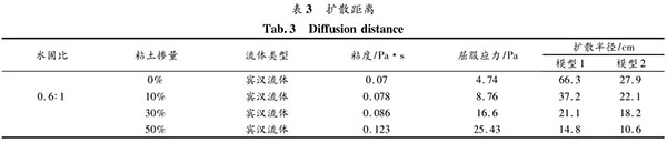 為研究流變性對(duì)擴(kuò)散距離的影響,引用前人研究的成果分析漿材流變特性對(duì)擴(kuò)散半徑的影響 [15-18] 。以水固比 0. 6∶ 1 的漿材為例,計(jì)算結(jié)果見表 3??傻贸鲆韵陆Y(jié)論: