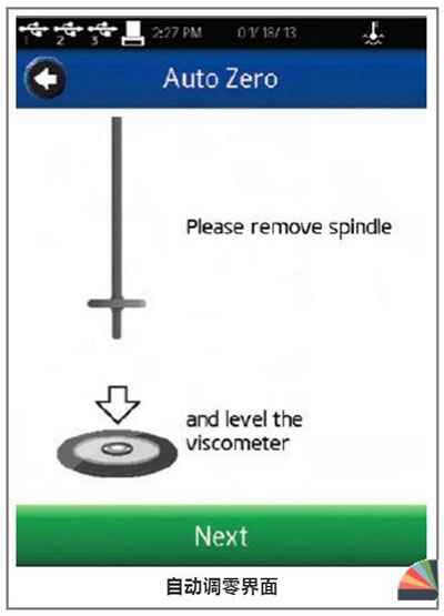 自動調零之前,必須確保粘度計處于水平狀態(tài),并且卸下所有的轉子和連接頭。當按下Next按鍵,粘度計將運轉大約13秒。在自動調零之后,按下Next按鍵,粘度計將會轉到粘度測試設置界面(Configure Viscosity Test)。
