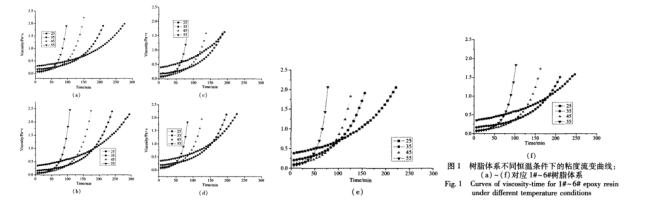 測試 RIMR?。埃常担銟渲w系在 25℃ 、35℃ 、45℃ 、55℃恒溫條件下的粘度 , 圖 1(a)、圖 1(b)、圖 1(c)、圖 1(d) 、圖 1(e)、圖 1(f)分別 為 1#-6#環(huán)氧樹脂體系在 25~55℃不同恒溫條件下的實測 粘度曲線。 在