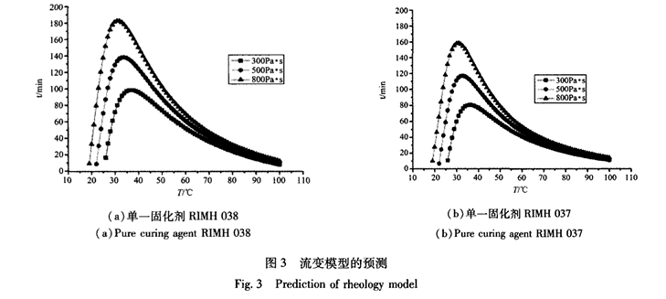 從表 3 中可以看出,同一配比下,達(dá)到同一目標(biāo)粘度的時間 隨溫度升高先增加再降低 ; 而同一溫度下,隨著固化劑RIMH 038含量的增加,達(dá)到目標(biāo)粘度的時間先降低再升高。x=0.0 時 ,最長適用期為114. 7min,對應(yīng)溫度為 35℃;x=1.0時,最長適用期為 137. 88min,對應(yīng)溫度為35℃。 說明預(yù)測模型的變化規(guī)律與實驗測試結(jié)果吻合。 使用單一固化劑RIMH?。埃常?和 RIMH 038,該環(huán)氧樹脂體系 在不同溫度下達(dá)到目標(biāo)粘度300mPa?S、500mPa?s和800mPa?S時溫度 與時間的關(guān)系如圖3所示。 從 圖 3 中可以看出 ,兩種固化劑配比下的樹脂體系在 3O~35℃ 下的適用期最長,結(jié)合表3數(shù)據(jù)可以看出,不同固化劑配比下該樹脂體系的最佳灌注溫度均在 30~35℃。