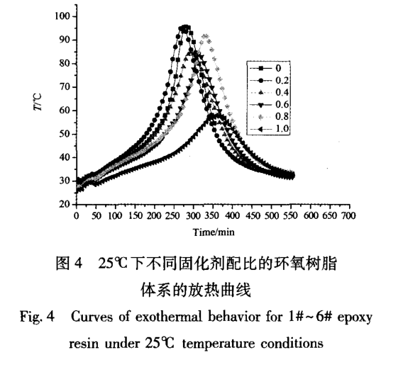從表 4 中可以看出 ,在同一恒溫水浴溫度下,不同固化劑配比的環(huán)氧樹脂體系中使用單一固化劑RIMH?。埃常傅臉渲w系的放熱峰溫度最低 ,其在 25℃、35℃ 、45℃下的放熱峰溫度分別為 57.8℃、52.1℃ 、85.9℃,使用單一固化劑RIMH?。埃常?的樹脂體系的放熱峰溫度最高,其在 25℃、35℃、45℃下的放熱峰溫度分別為95.9℃ 、186.9℃、215.3℃,其他配比下的放熱峰溫度與單一固化劑RIMH?。埃常?的樹脂體系