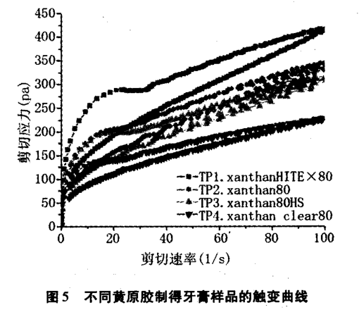 圖 2 中各黃原膠溶液的觸變性較相近, 由于滯后曲線中形成支弧形,表示溶液有凝膠強度,因破壞凝膠結構需要的應力,使溶液恢復正常表觀粘度。