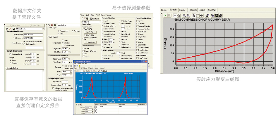 -例如彈性、咀嚼性、硬度等諸多參數(shù),可通過(guò)內(nèi)嵌的參數(shù)計(jì)算模型來(lái)進(jìn)行高級(jí)數(shù)據(jù)分析。