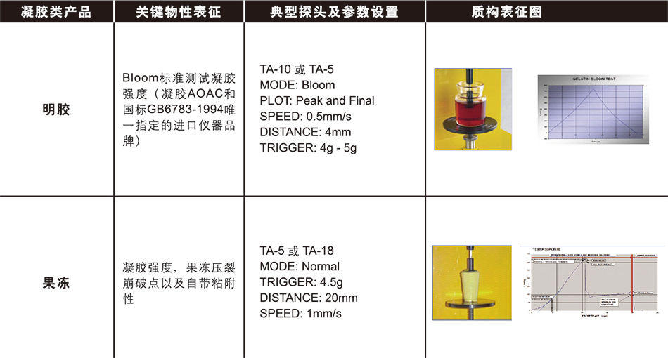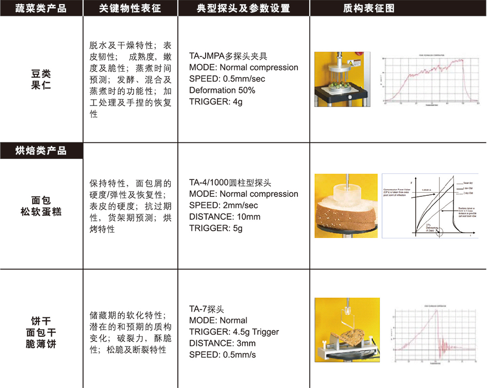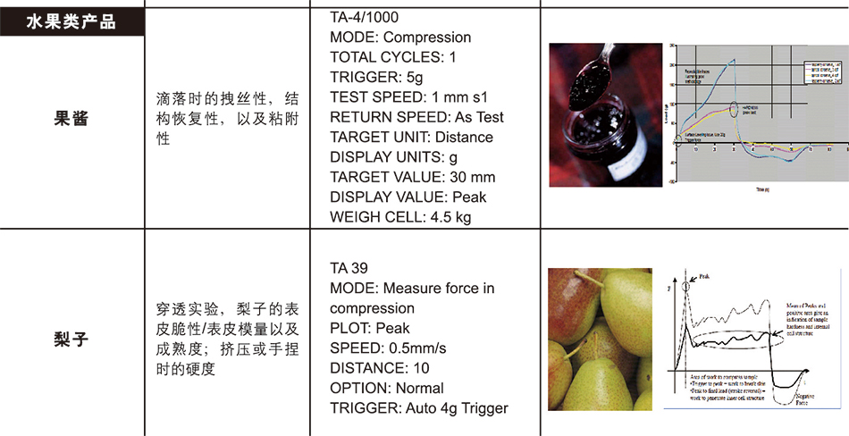 可應(yīng)用于肉制品、糧油食品、面食、谷物、糖果、果蔬、凝膠果醬等食品的物性學(xué)分析;可以分析食品的嫩度、硬度、脆性、粘性、彈性、內(nèi)聚性、咀嚼性拉伸強(qiáng)度、抗壓強(qiáng)度、穿透強(qiáng)度等各項(xiàng)物性指標(biāo)。還可用于個(gè)人護(hù)理品、膠類(明膠/果膠等)藥品膠囊、民用和工業(yè)粘結(jié)材料(膠粘劑樹脂)等行業(yè)