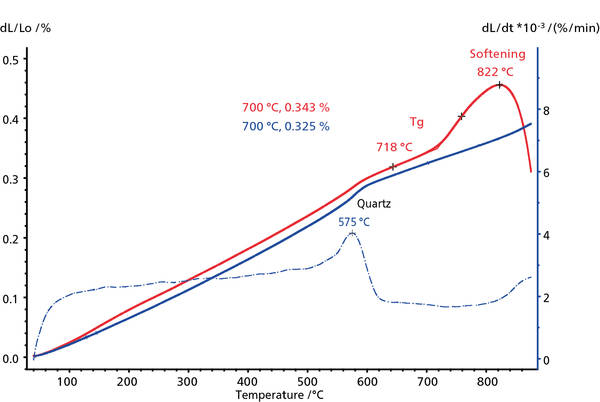 釉料與基體之間的匹配性差是造成開(kāi)裂(蛛網(wǎng)式的裂縫布滿(mǎn)釉面)的主要原因。導(dǎo)致這種現(xiàn)象產(chǎn)生的重要原因之一是釉料與基體的熱膨脹不匹配。為了防止開(kāi)裂,釉料的熱膨脹系數(shù)必須小于基體。下圖顯示的是基體(藍(lán)色曲線)與釉料(紅色曲線)熱膨脹行為的對(duì)比圖,在 700°C(略低于釉料的玻璃化轉(zhuǎn)變溫度 718°C)時(shí)兩者膨脹系數(shù)之間的差異為 0.02%。釉料的軟化發(fā)生在 822°C。由于釉的膨脹系數(shù)較高,將導(dǎo)致在冷卻過(guò)程中產(chǎn)生與膨脹成比例的不必要的張應(yīng)力。