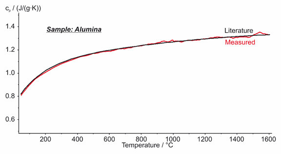 圖中所示為在室溫至1600°C的溫度范圍內對多晶氧化鋁樣品的比熱測量結果,同時給出了純氧化鋁的比熱文獻值曲線。能夠清楚地看到在文獻值與測量值之間差別很小,最大偏差在 2% 范圍內,這充分顯示了 DSC 404 F1 Pegasus® 的優(yōu)異的比熱測量精度。