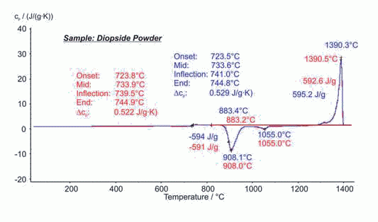 圖中顯示的是透輝石玻璃粉末兩次測試的結果。玻璃化轉變發(fā)生在723°C~745°C之間,重結晶出現(xiàn)在883°C(起始點),熔融出現(xiàn)在1390°C(主峰溫度)。兩次測試分別取樣,得到的數(shù)據(jù)包括特征溫度和相應的熱焓計算都吻合的很好,而且兩次測試過程中樣品比熱也基本無差別。這說明DSC 404 F1 Pegasus? 具有非常出色的穩(wěn)定性和測試重復性。