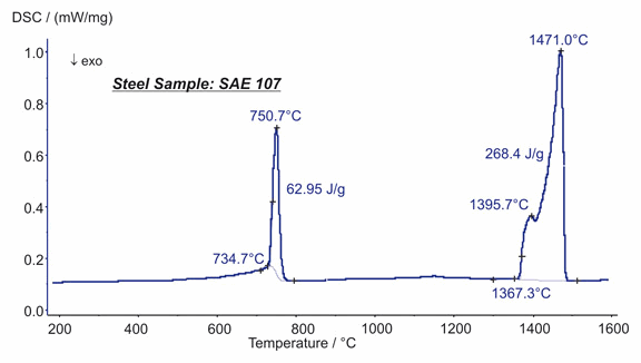 圖中顯示的是鋼(SAE 107)的相結構轉變測量。在 751°C 前后,發(fā)生了兩種相互重疊的相變過程,735°C 之前熱流的平緩增大是由居里轉變(鐵磁性能的轉變)引起,而高而尖銳的主峰則由結晶結構的改變(鐵素體轉變成奧氏體)所致,其相應吸熱熱焓為 63J/g。在 1367°C 可以觀測到兩步熔融過程(峰值在 1395°C 與 1471°C),熔融熱焓為 268 J/g。