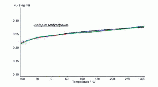 使用DSC 404 F1 Pegasus® 新型低溫爐體測試金屬鉬從-100°C~300°C之間的比熱,實驗重復測試三次。三次測試結果的分散度很小,在2%以內。圖中黑色曲線是純金屬鉬室溫至300°C的文獻值,測試數(shù)據(jù)與文獻值的偏差小于2%。這表明DSC 404 F1 Pegasus® 在低溫依然保持很好的性能。