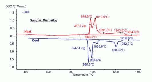 青銅合金是一種銅基合金,在古代人們就開始用它作為武器、容器或其他的金屬制品。今天它還經(jīng)常被做成軸承和彈簧元件。根據(jù)合金中錫的含量和添加劑的比例不同,合金的熔融行為會(huì)發(fā)生改變。圖中的合金樣品是用在滲透工藝中的。在521°C和568°C(起始點(diǎn))范圍內(nèi)樣品發(fā)生固相相變。熔融出現(xiàn)在777°C,整個(gè)熔程跨度超過200K,994°C后樣品完全熔化。