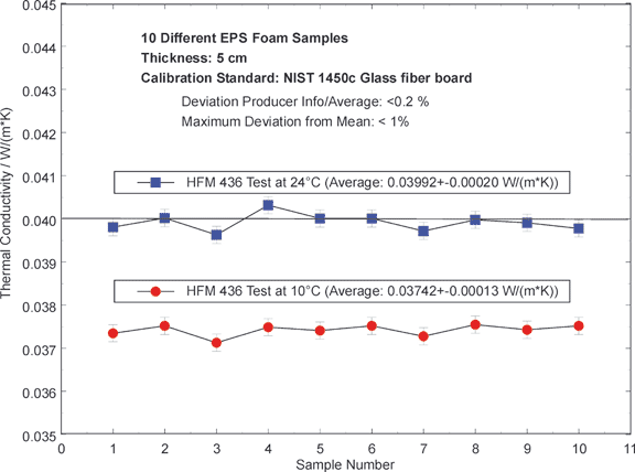 膨脹聚苯乙烯是在絕熱建筑材料領(lǐng)域使用得最多的材料之一。例中顯示了對(duì)一種商業(yè)化的膨脹聚苯乙烯材料(EPS 040)的質(zhì)量檢測(cè)結(jié)果。在 24°C 、以及按照 DIN EN 13163 標(biāo)準(zhǔn)在 10°C 下測(cè)量了同一批號(hào)中的十個(gè)樣品。可以清晰地看到不同樣品之間的測(cè)量偏差小于 1%。根據(jù) DIN 13163 計(jì)算得到的導(dǎo)熱系數(shù) λ 90/90 為 0.03808 W/(m*K)。