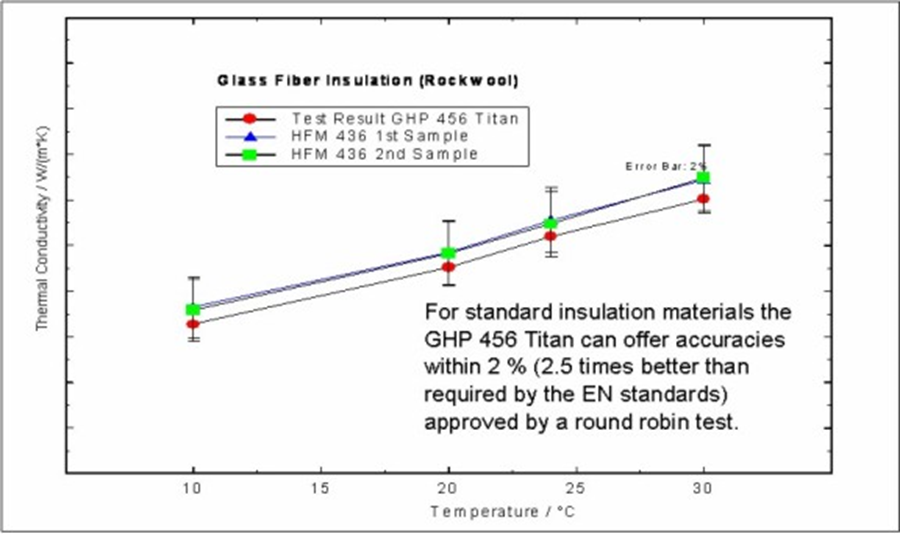 礦棉是一種用途廣泛的材料,主要用于住宅建筑的保溫。本例使用保護(hù)熱板法(GHP 456 Titan)和熱流法(HFM 436 series),對(duì)礦物纖維在 10℃ 到30℃ 之間進(jìn)行循環(huán)測(cè)試,研究其導(dǎo)熱性能。和其他大多數(shù)保溫材料類似,礦物纖維在室溫附近的導(dǎo)熱系數(shù)隨著溫度的升高呈線性增加。用不同的測(cè)試儀器得到的結(jié)果有很好的一致性。通過循環(huán)測(cè)試進(jìn)一步證明,保護(hù)熱板法的測(cè)試精度可以達(dá)到 2 %。