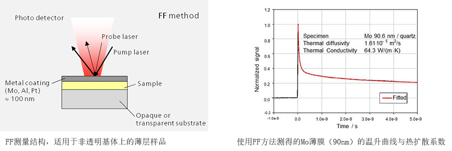 除了 RF 方法之外,測(cè)量也可以使用前部加熱/前部探測(cè)(FF)的結(jié)構(gòu)進(jìn)行。“Front”一詞這里指的是沉積于基體上的薄膜的外表面,而“Rear”一詞指的是薄膜與基體接觸的一面。