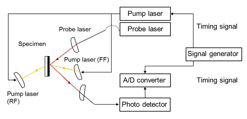 對(duì)于皮秒級(jí)熱反射分析儀 PicoTR,照射到樣品的加熱面上的是脈沖寬度僅為 0.5ps 的激光脈沖,重復(fù)周期為 50ns。使用探測(cè)激光,記錄檢測(cè)面相應(yīng)的溫度響應(yīng)。
