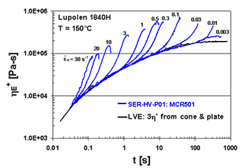 圖 6 描述了支化聚丙烯(B-PP)和高規(guī)整線性聚丙烯(H-PP)的差異。兩種聚丙烯的熔融指數(shù) MI 都是 3,粘度曲線也基本一致。在圖6,兩種聚丙烯在一定的拉伸應力下,分子結(jié)構的差異就變得很明顯。支化聚丙烯(B-PP)在圖 6a 中表現(xiàn)出明顯的支化效應,拉伸變硬。而高規(guī)整線性聚丙烯(H-PP)在圖 6b 的拉伸粘度并無明顯增大。