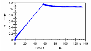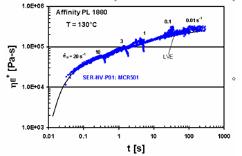 應力階梯變化(蠕變及回復)、應變階梯變化(應力松弛)、速率階梯變化(應力增加/開始流動)可以測量材料對于給定剪切應力、剪切應變或剪切速率的時間(瞬時)響應。分析方法包括計算一些重要的材料參數(shù),如零剪切粘度、平臺模量、蠕變?nèi)崃亢蛯⑺矐B(tài)材料函數(shù)轉(zhuǎn)換為動態(tài)材料函數(shù)- G’(ω)G”(ω)。圖六中,提供了應力增加測試實例。