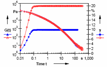 在這個實驗中,施加一個恒定的應變 Ý,測量應力隨時間的變化曲線,通常用松弛模量 G(t)=ζ(t)/γ來表示。從圖 4 中可以看出,配置同步電子整流馬達(EC 馬達)的流變儀可以在 100ms內(nèi)達到設定應變,并且無過沖。兩個設定不同應變的數(shù)據(jù)吻合的很好,也證明了所選應變在線性粘彈區(qū)內(nèi)。
