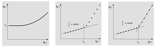 塑性流動(plastic flow)的流動曲線如圖 14-7(b)所示,曲線不經(jīng)過原點,在剪切應(yīng)力 τ軸上的某處有交點,將曲線外延至=0,在 τ 軸上某一點可以屈服值(yield value)。當(dāng)剪切應(yīng)力達不到屈服值以上時,液體在剪切應(yīng)力作用下不發(fā)生流動,而表現(xiàn)為彈性變形。當(dāng)剪切應(yīng)力增加至屈服值時,液體開始流動,剪切速率和剪切應(yīng)力 τ 呈直線關(guān)系。液體的這種變形稱為塑性流動。引起液體流動的最低剪切應(yīng)力為屈服值 τ0。