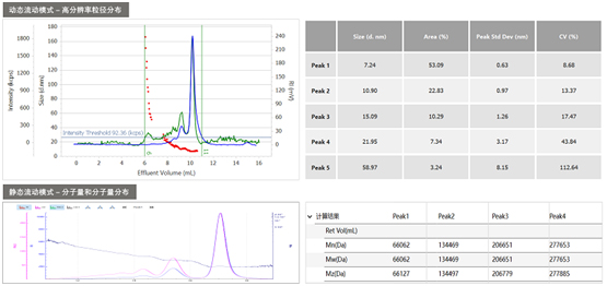 BeNano動靜態(tài)流動模式(Flow Mode)是將納米粒度及Zeta電位儀同一個分離前端(FFF、GPC/SEC)相連接。分離前端可以根據(jù)尺寸將樣品進(jìn)行分離,依次流出。通過檢測每個流出組分的動態(tài)光散射信號和靜態(tài)光散射號,并結(jié)合分離前端的示差折光RI或者紫外UV信號,得到高分辨率且不依賴于計(jì)算模型的粒徑分布、分子量分布信息。