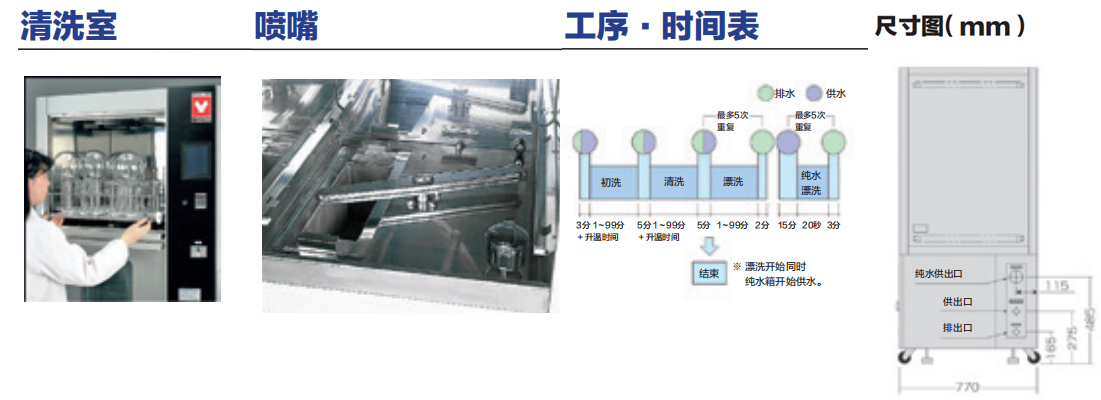 漂洗可單獨(dú)最多設(shè)置5次,純水50L漂洗可設(shè)定5次(需連接選配的純水供給裝置)。到達(dá)規(guī)定水量后開始清洗,到達(dá)設(shè)定溫度后開始時(shí)間計(jì)時(shí)。 |